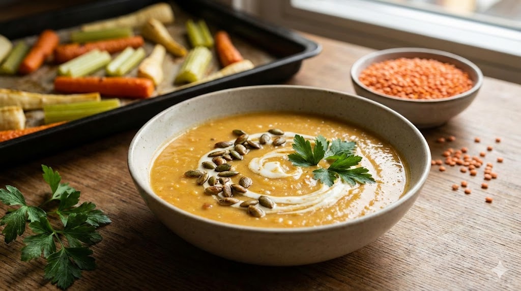 Klíčem k dokonalé chuti této polévky je pečení. Místo abychom zeleninu jen vařili ve vodě, necháme ji zkaramelizovat v troubě. Tím se uvolní přirozené cukry a polévka získá hlubokou, oříškovou chuť, kterou vařením nikdy nedocílíte.