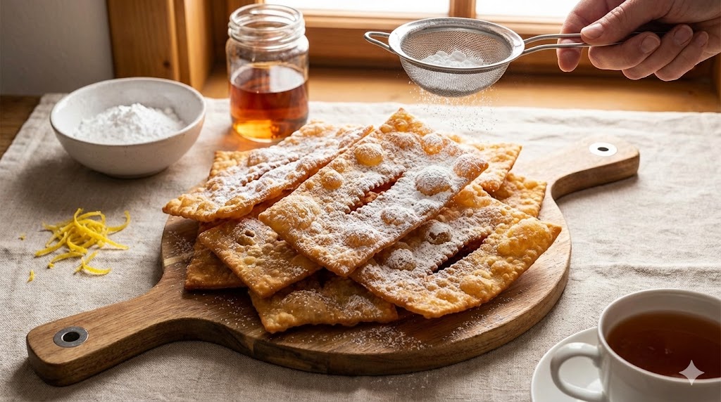 Odpočinuté těsto rozválejte na pomoučněném vále na co nejtenčí plát (cca 1–2 mm). Čím tenčí, tím víc se při smažení nafouknou a budou křupavější. Rádýlkem nebo nožem krájejte různé tvary – obdélníky, kosočtverce nebo trojúhelníky. Klasika: Každý kousek uprostřed ještě jednou nebo dvakrát prořízněte nožem (jako knoflíkovou dírku). Díky tomu se lépe prosmaží.